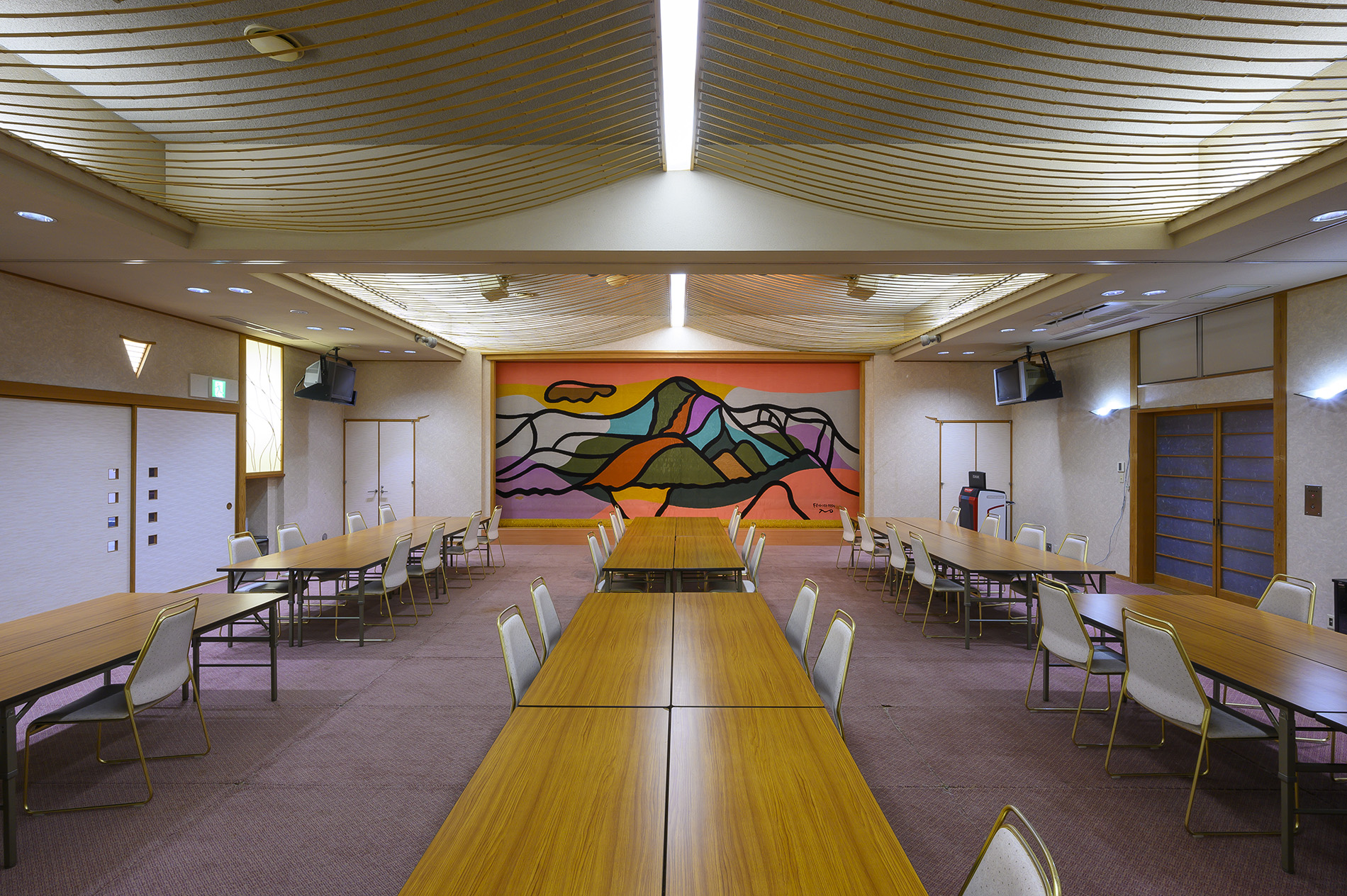本館一階のお食事処は、全席椅子テーブルの配置となっております。*収容人数 ~100名